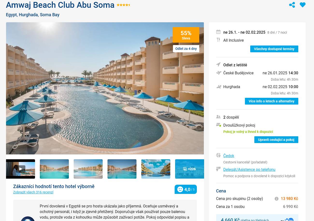 Objevte zimní pohodu na pobřeží Rudého moře a užijte si luxusní dovolenou v Egyptě v resortu Amwaj Beach Club Abu Soma. Čeká vás 8 dní plných relaxace na písečné pláži, all-inclusive pohostinnost, bazény, animační programy a úžasné výhledy.