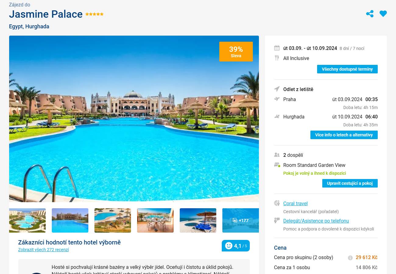 Hotel Jasmine Palace kombinuje moderní styl a orientální architekturu a je umístěn v oblasti Egypt, Hurghada. Patří mezi vyhledávané ubytování pro skvělou dovolenou u moře s velkým množstvím zajímavých zážitků. Děti potěší vodní skluzavky i pěkné hřiště.