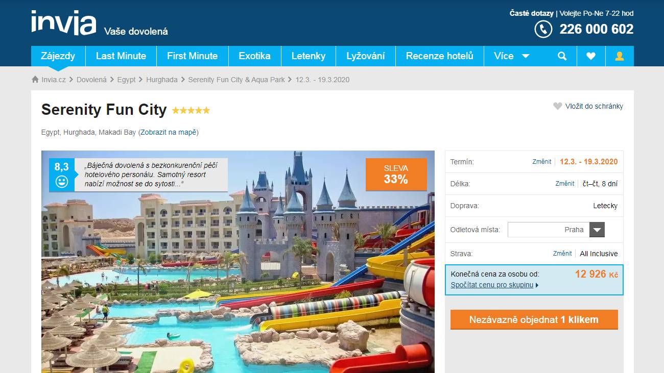 Luxusní hotel Serenity Fun City & Aqua Park, v lokalitě Makadi Bay s vlastním lunaparkem a aquaparkem se spoustou bazénů rozmístěných v rozsáhlé zahradě.