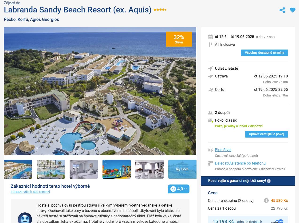 Řecko, jak ho milujete! Dlouhá písčitá pláž, azurové moře a all inclusive bez starostí – to je Labranda Sandy Beach Resort na ostrově Korfu. Užijte si léto naplno v hotelu s výborným zázemím pro rodiny i páry. Skvělé jídlo, bazény, animační programy.