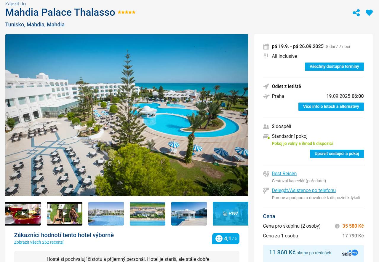 Představte si nekonečnou písečnou pláž, tyrkysové moře a elegantní hotel. Mahdia Palace Thalasso nabízí prostorné pokoje, skvělé wellness centrum a kuchyni, která potěší i náročné gurmány.
