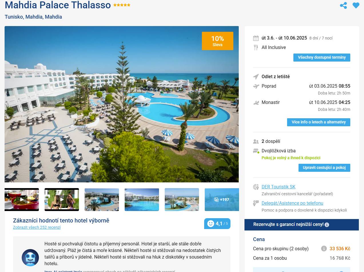 Představte si nekonečnou písečnou pláž, tyrkysové moře a elegantní hotel. Mahdia Palace Thalasso nabízí prostorné pokoje, skvělé wellness centrum a kuchyni, která potěší i náročné gurmány.